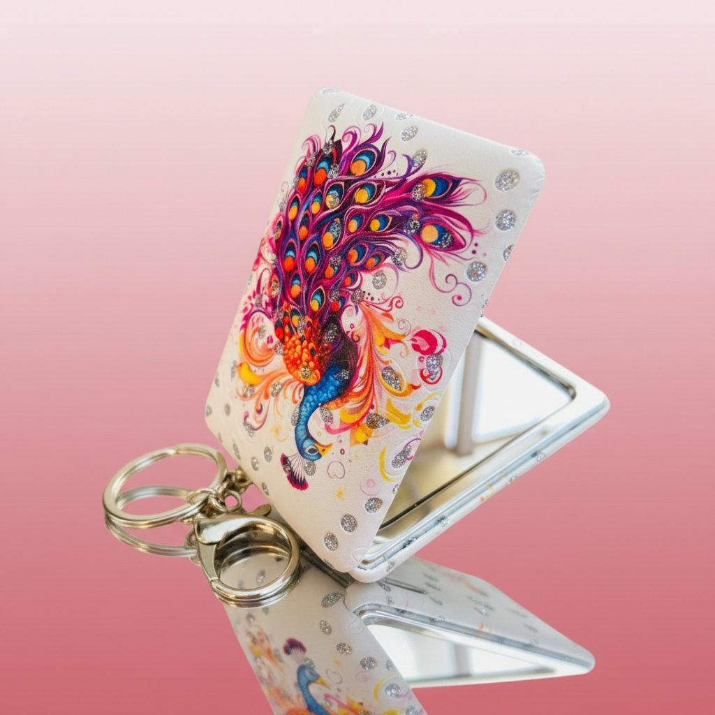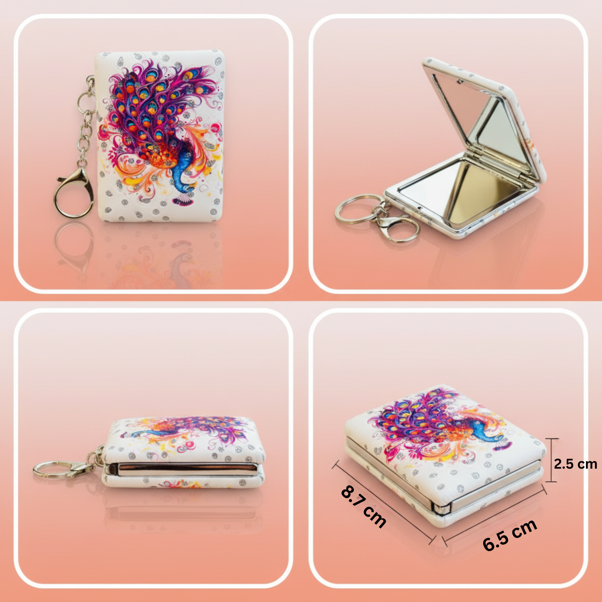 Peacock Compact Mirror Keychain - Double-Sided Folding Makeup Mirror